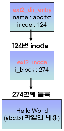 그림 처럼 디렉토리 엔트리(ext2_dir_entry)에 파일명과 파일의 inode 위치를 저장하고 있어 해당 파일의 inode를 찾아갈 수 있습니다. inode의 i_block에 파일의 실제 내용이 담긴 블록 주소를 저장하고 있습니다.