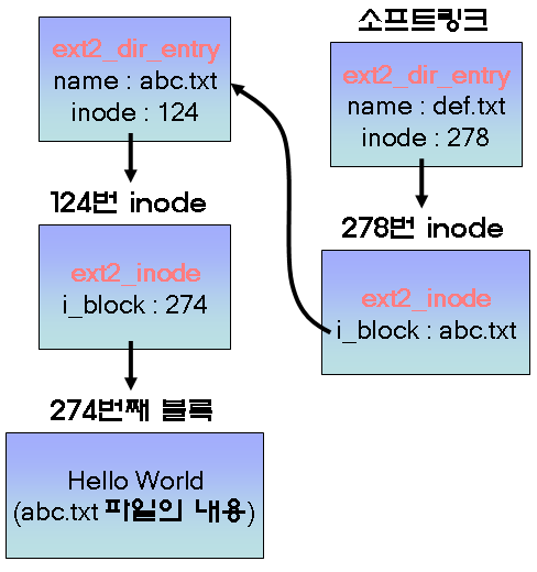 소프트 링크는 하드 링크와는 달리 따로 inode를 만들고 이 inode의 i_block에 파일내용의 위치를 저장하는 것이 아니라 링크할 파일의 경로와 파일명을 저장하게 됩니다.
