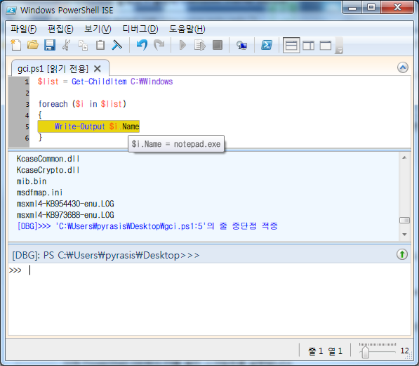 스크립트가 실행되면 그림과 같이 $i.name이 notepad.exe일 때 브레이크 포인트가 걸립니다.