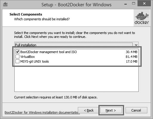 - Boot2Docker Management script and ISO: Boot2Docker를 설치할 것이므로 반드시 선택합니다.
