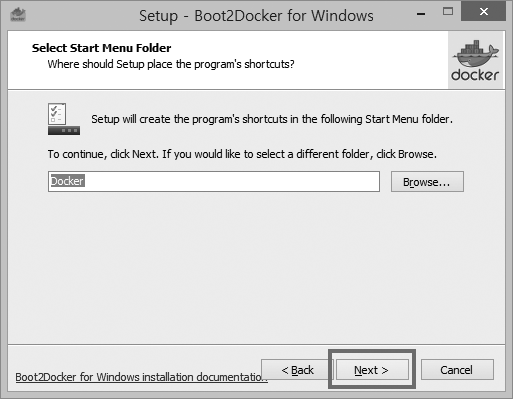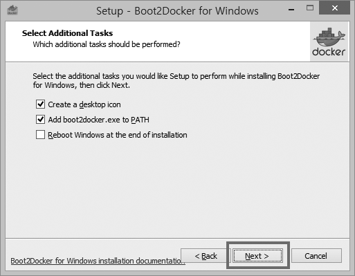 Boot2Docker 경로를 환경 변수에 등록할지 설정합니다. 기본값 그대로 사용하고, Next 버튼을 클릭합니다.