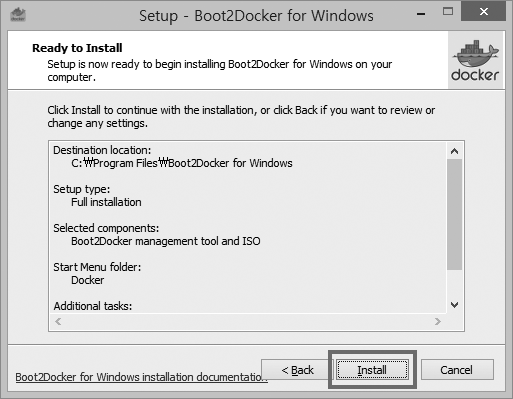 Install 버튼을 클릭하여 Boot2Docker를 설치합니다.