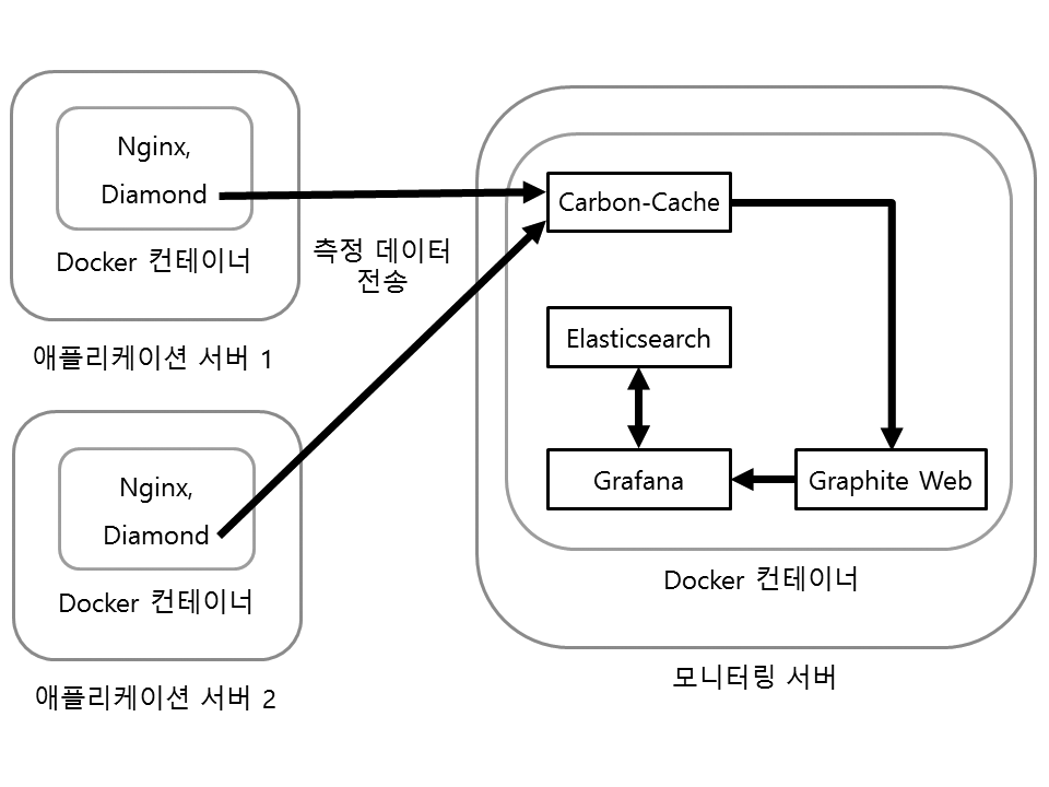 - Diamond: 서버 자원의 측정치 데이터를 수집하여 Carbon-Cache로 전송하는 도구입니다. CPU, 메모리, 네트워크 사용량과 디스크 I/O 등의 데이터를 수집합니다.