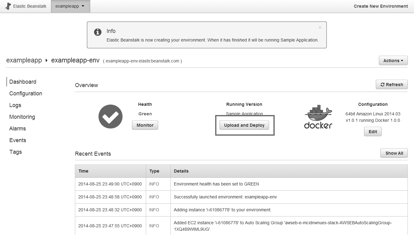 Elastic Beanstalk 환경 페이지에서 Upload and Deploy 버튼을 클릭합니다.