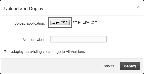 파일을 열면 Version label에 파일명이 그대로 입력됩니다. 애플리케이션을 업로드할 때마다 Version label이 달라져야 합니다. 여기서는 exampleapp1을 입력합니다(다음 번에는 exampleapp2 exampleapp3 등으로 입력합니다). 설정이 완료되었으면 Deploy 버튼을 클릭합니다.
