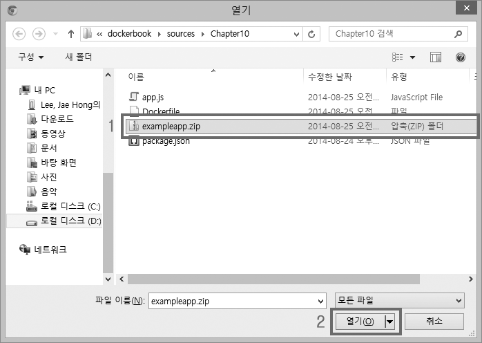 파일 열기 창에서 방금 압축했던 exampleapp.zip 파일을 선택하고 열기 버튼을 클릭합니다.
