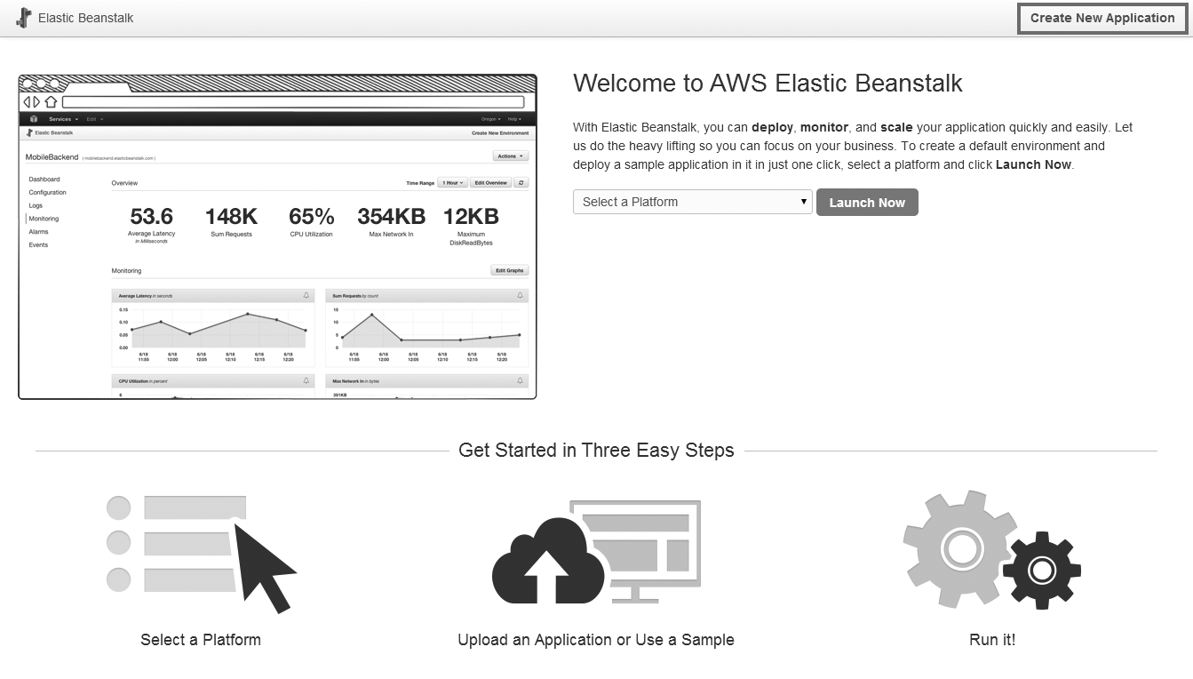 AWS 콘솔의 Elastic Beanstalk로 이동합니다. 생성한 Elastic Beanstalk 애플리케이션이 하나도 없을 때 그림 10-2와 같은 페이지가 표시됩니다. 위쪽 Create New Application을 클릭합니다(Select a Platform에서 플랫폼을 선택하고 Launch Now 버튼을 클릭하면 옵션 설정 없이 바로 생성됩니다).