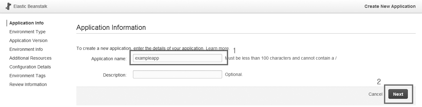 - Application name: 애플리케이션 이름을 설정합니다. exampleapp을 입력합니다.