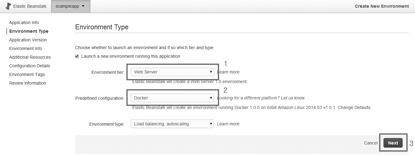 애플리케이션을 실행할 환경(Environment)을 생성합니다. 환경은 EC2 인스턴스, Auto Scaling, ELB 등을 조합한 플랫폼을 뜻합니다.