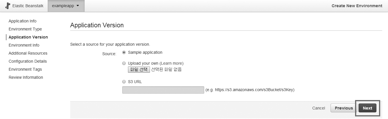 - Enable rolling updates: 단계적 업데이트를 사용하는 옵션입니다. EC2 인스턴스의 유형을 변경하거나 EC2 인스턴스를 교체할 때 EC2 인스턴스가 정지되므로 일시적으로 서비스가 중단됩니다. 서비스가 중단되지 않도록 일부 EC2 인스턴스가 운영 중인 상태에서 부분적으로 업데이트합니다. 업데이트가 완료된 EC2 인스턴스에서 트래픽을 처리하고 남은 EC2 인스턴스도 업데이트합니다. 이 기능은 애플리케이션 배포와는 관련이 없습니다. 이번에는 사용하지 않을 것이므로 기본값 그대로 비워둡니다. 자세한 내용은 링크를 참조하기 바랍니다. http://docs.aws.amazon.com/elasticbeanstalk/latest/dg/using-features.rollingupdates.html