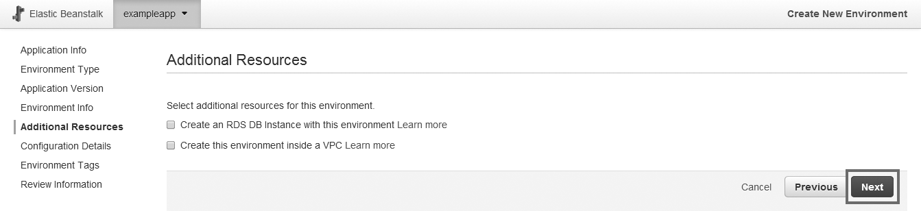 - Create an RDS DB Instance with this environment: RDS DB 인스턴스를 생성하는 옵션입니다. 이번에는 DB 인스턴스를 생성하지 않을 것이므로 기본값 그대로 체크하지 않습니다.