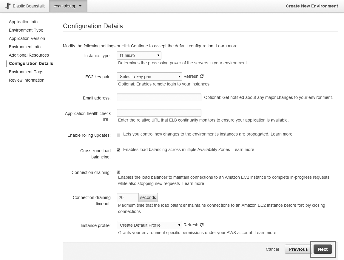 그림 10-8 Elastic Beanstalk 환경 세부 설정