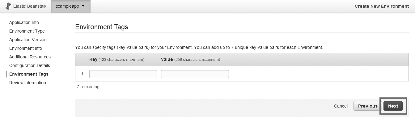Elastic Beanstalk의 환경에 태그를 설정합니다. 7개까지 생성할 수 있습니다. Next 버튼을 클릭합니다.