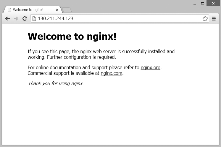 웹 브라우저를 실행하고 네트워크 부하 분산의 IP 주소로 접속하면 Container Engine의 Pod에서 실행한 nginx의 기본 페이지가 표시됩니다.