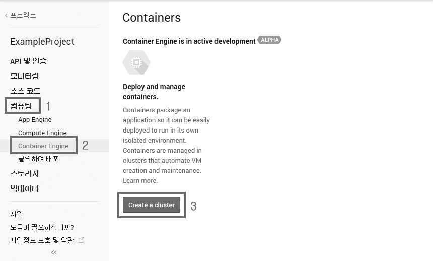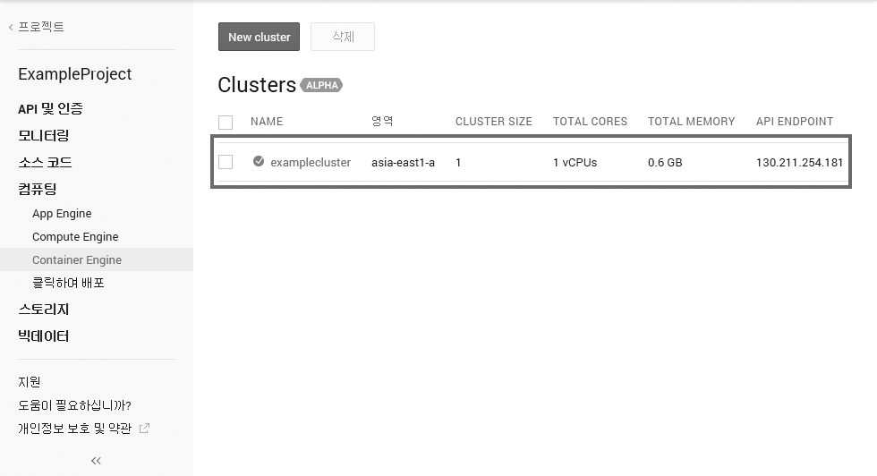 구글 클라우드 콘솔(https://console.developers.google.com)에 접속한 뒤 프로젝트를 선택합니다. 그리고 컴퓨팅 → Container Engine을 클릭하고 Create a cluster 버튼을 클릭합니다.