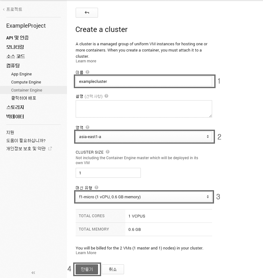- 이름: 클러스터 이름입니다. 여기서는 examplecluster를 입력합니다.
