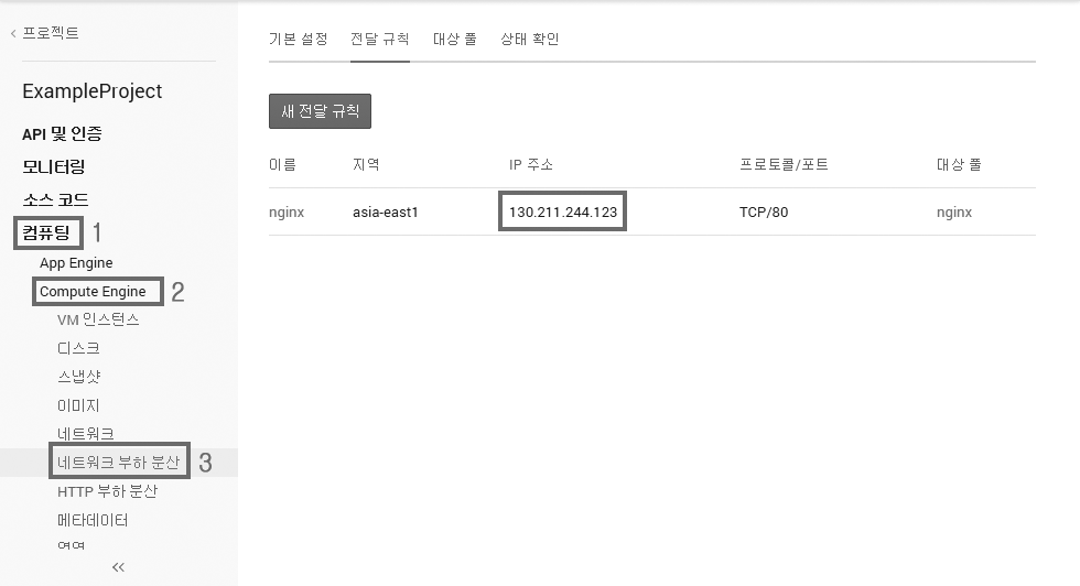 다시 구글 클라우드 콘솔로 접속하여 컴퓨팅 → Compute Engine → 네트워크 부하 분산을 클릭한 뒤 IP 주소를 확인합니다.
