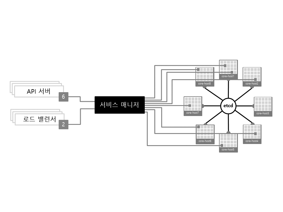 그림 15-2는 fleet를 이용하여 API 서버 컨테이너 6개와 로드 밸런서 컨테이너 2개를 CoreOS 클러스터에 배포한 모습입니다. 클러스터 상황에 맞게 fleet가 알아서 호스트를 선택한 뒤 Docker 컨테이너를 배포합니다. 또는, 특정 호스트를 설정하여 컨테이너를 배포할 수도 있습니다.