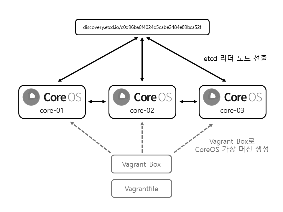 CoreOS에서는 etcd를 손쉽게 사용할 수 있도록 discovery URL을 서비스 형태로 제공합니다. 이 URL은 etcd 리더 노드(마스터)를 선출할 때 사용됩니다.