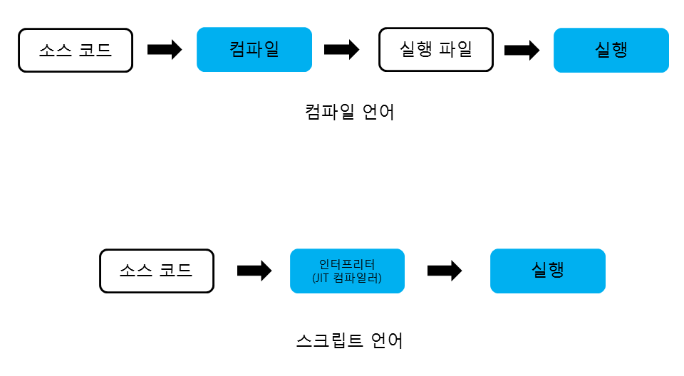 스크립트 언어는 인터프리터가 텍스트 형태의 소스 코드를 해석하여 실행합니다. 최근에는 인터프리터의 느린 성능을 개선하기 위해 JIT(Just-In-Time) 컴파일러라고 하여 실행 시점에 기계어로 바로 컴파일하는 방식이 등장했습니다. 하지만 스크립트 언어는 텍스트 형태를 직접 처리하므로 컴파일 언어에 비해 성능상 한계가 있습니다.