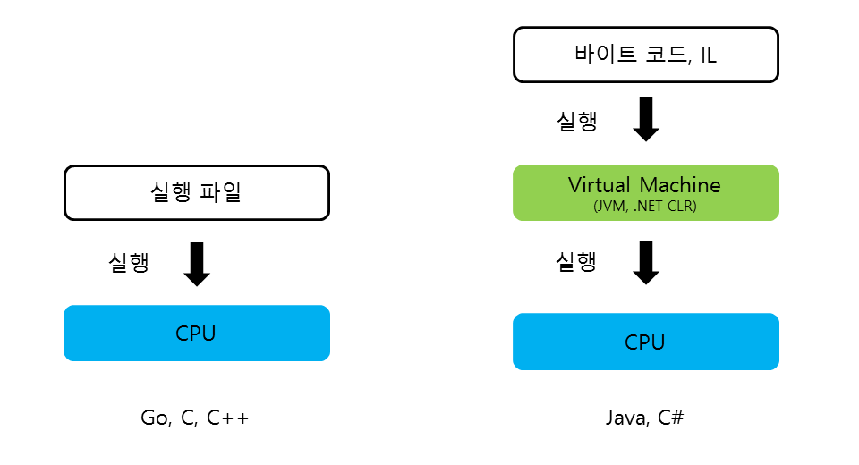 Go 언어는 컴파일 언어이면서 네이티브 바이너리 형식이기 때문에 C, C++처럼 완전한 실행 파일을 만들어냅니다. 그림 1-3처럼 Java, C#은 컴파일 언어지만 실행 파일이 아닌 바이트코드, IL(Intermediate Language, 중간 언어)을 생성합니다. 그리고 바이트코드와 IL은 가상 머신(Virtual Machine) 위에서 실행됩니다. Go 언어는 Java, C#과는 달리 프로그램 실행을 위해 덩치가 큰 가상 머신을 설치하지 않아도 되므로 실행 환경이 복잡하지 않습니다.