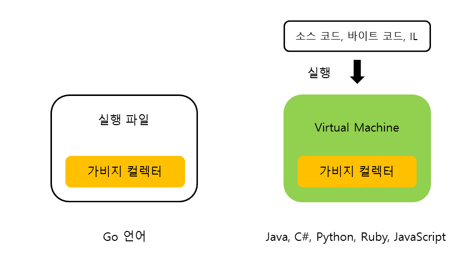 그림 1-4와 같이 Go 언어는 메모리를 관리해주는 가비지 컬렉터(Garbage Collector)가 실행 파일안에 내장되어 있습니다. 가상 머신 위에서 실행되는 언어들처럼 가상 머신이 메모리 관리를 해주는 것과 차이가 있습니다. 즉 Go 언어는 C, C++ 실행 파일 방식의 간결함과 가상 머신의 가비지 컬렉션 기능을 함께 가지고 있습니다.