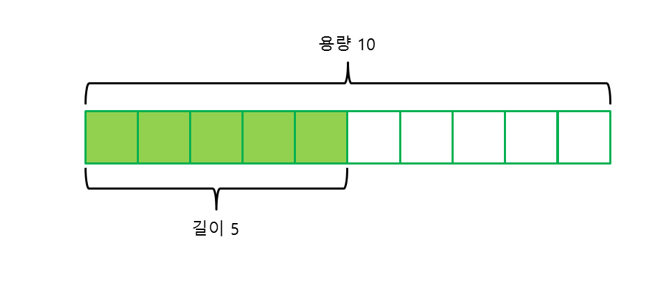 단 용량이 길이보다 크더라도 길이를 벗어난 인덱스에는 접근할 수 없습니다.