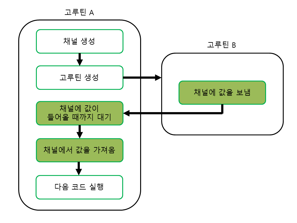그림 34-2 고루틴과 동기 채널의 흐름