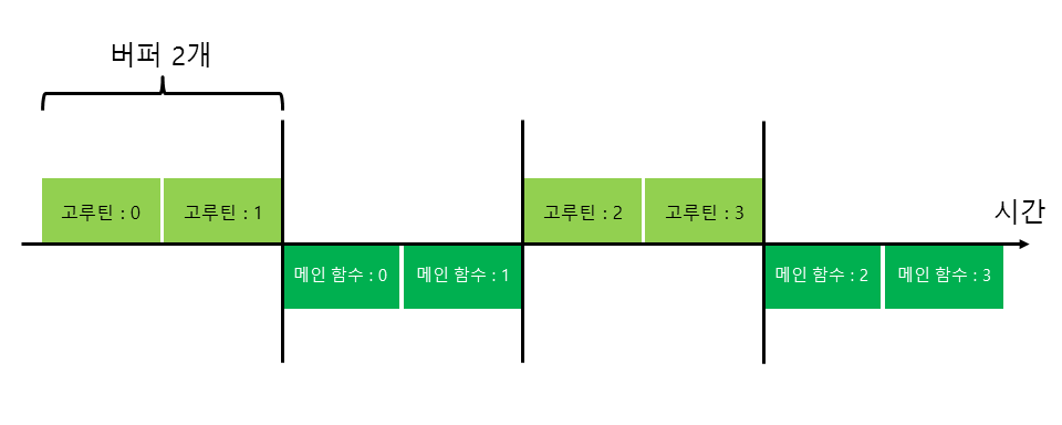 비동기 채널에 버퍼가 2개이므로 done에는 이미 값이 2개 들어있습니다. 따라서 루프를 두 번 반복하면서 <-done에서 값을 꺼냅니다. 그 다음에는 채널이 비었으므로 실행을 멈추고 대기합니다. 그리고 다시 고루틴 쪽에서 값을 두 번 보내고, 메인 함수에서 두 번 꺼냅니다. 즉 고루틴 → 고루틴 → 메인 함수 → 메인 함수 순서로 실행됩니다.