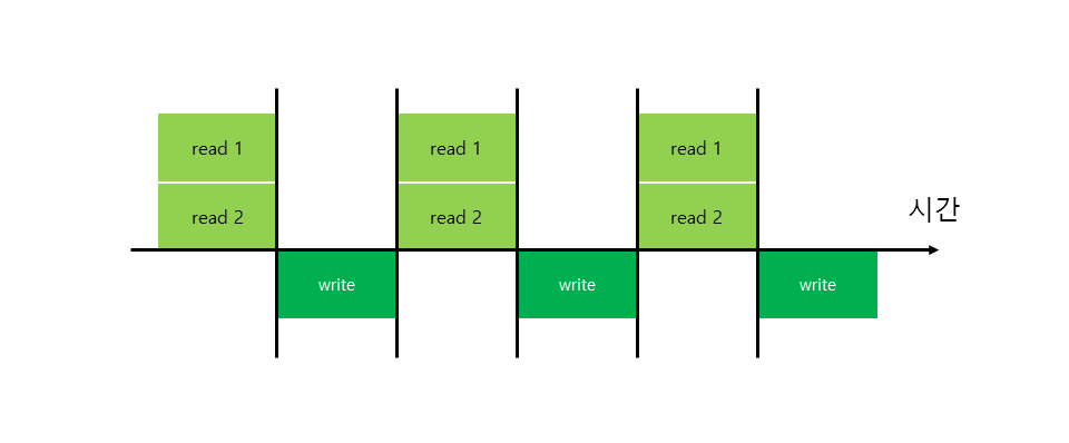 실행해보면 각각의 순서는 매번 달라지지만 실행되는 모양은 규칙적입니다. 즉 read 1, read 2 읽기 동작이 모두 끝나야 write 쓰기 동작이 시작됩니다. 마찬가지로 쓰기 동작이 끝나야 읽기 동작이 시작됩니다. 읽기 동작끼리는 서로를 막지 않으므로 항상 동시에 실행됩니다.