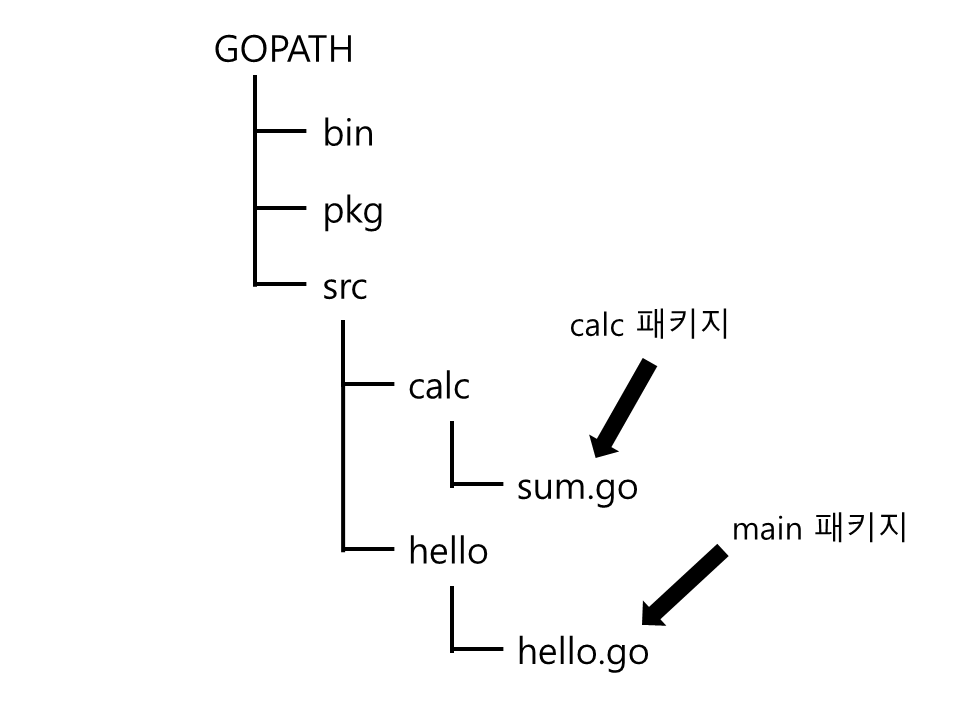 여기서 디렉터리의 이름은 패키지 이름과 동일하게 만듭니다. 즉, calc라는 패키지가 있으면 디렉터리는 GOPATH/src/calc가 됩니다. .go 소스 파일의 이름은 패키지 이름과 같지 않아도 되며 각자 상황에 맞게 적절히 짓습니다.