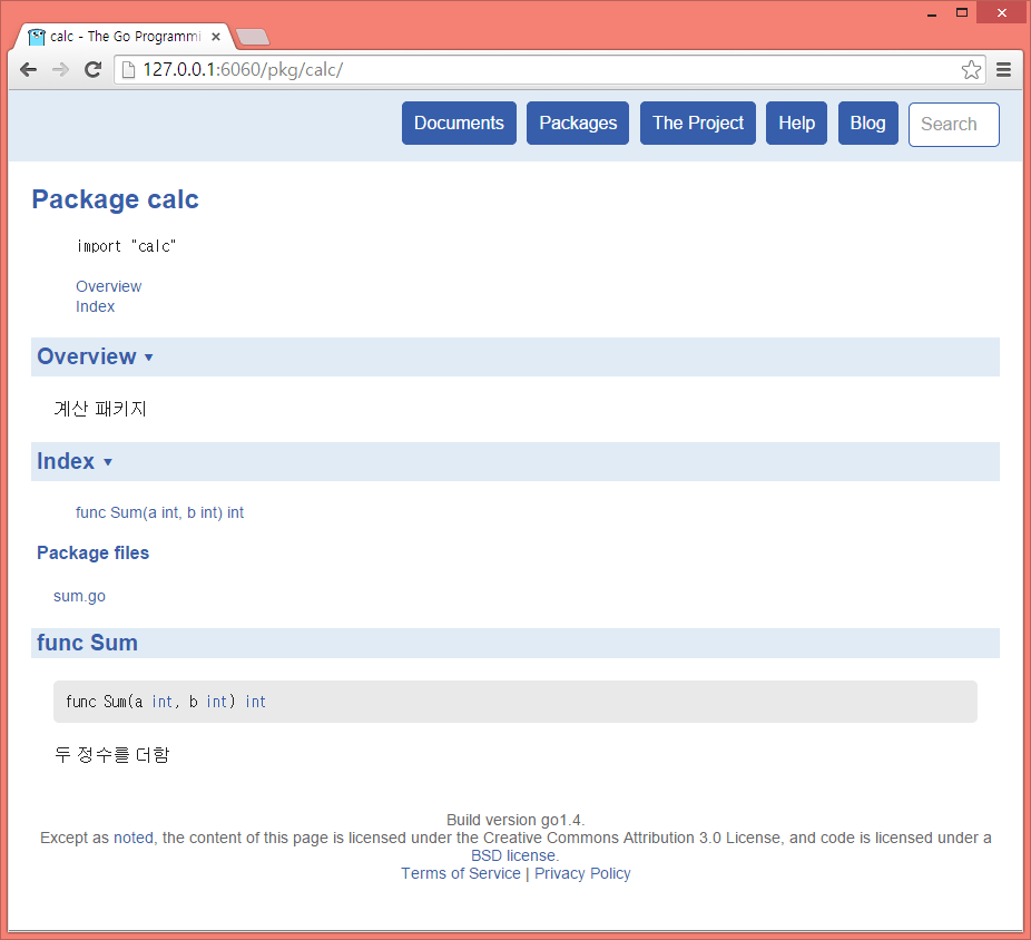 웹 브라우저에서 http://127.0.0.1:6060/pkg/calc으로 접속하면 다음과 같이 calc 패키지의 문서가 표시됩니다.