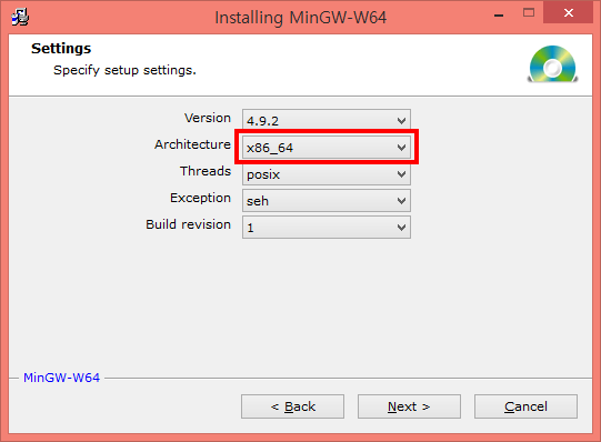 MinGW-W64를 설치할 때 그림 62-1과 같이 Architecture를 x86_64로 선택합니다.