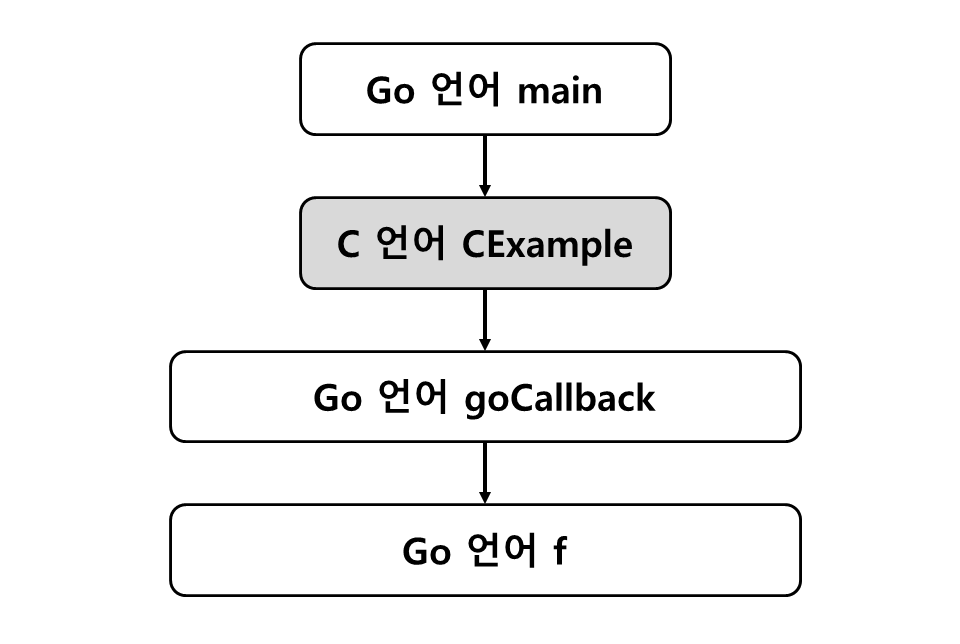 즉 함수의 실행 순서는 main → C.CExample → goCallback → f입니다.