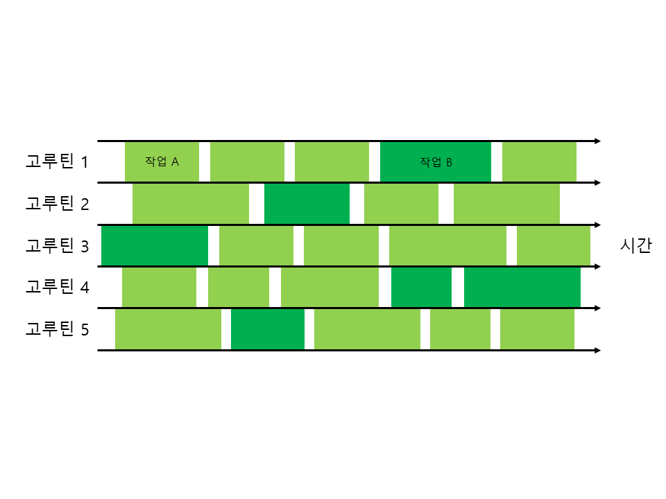 for i := 0; i < numWorkers; i++ { // 작업을 처리할 고루틴을 5개 생성