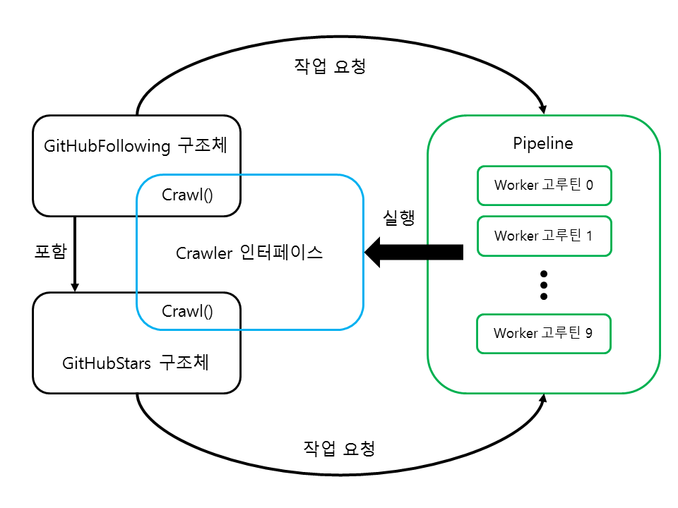 팔로잉 페이지와 별표 페이지는 각각 GitHubFollowing, GitHubStars 구조체와 메서드로 구현하였습니다. 그리고 파이프라인의 Worker 함수에서는 두 구조체를 모두 처리할 수 있도록 Crawler 인터페이스를 활용합니다.