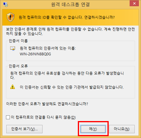 인증서 경고 창이 표시됩니다. 예(Y) 버튼을 클릭합니다.
