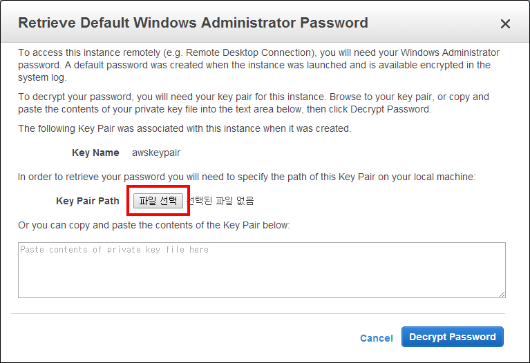 Administrator 비밀번호 복호화 창이 표시됩니다. 저는 Windows EC2 인스턴스를 생성할 때 키 쌍으로 awskeypair를 설정했습니다. Key Pair Path의 파일 선택 버튼을 클릭합니다.