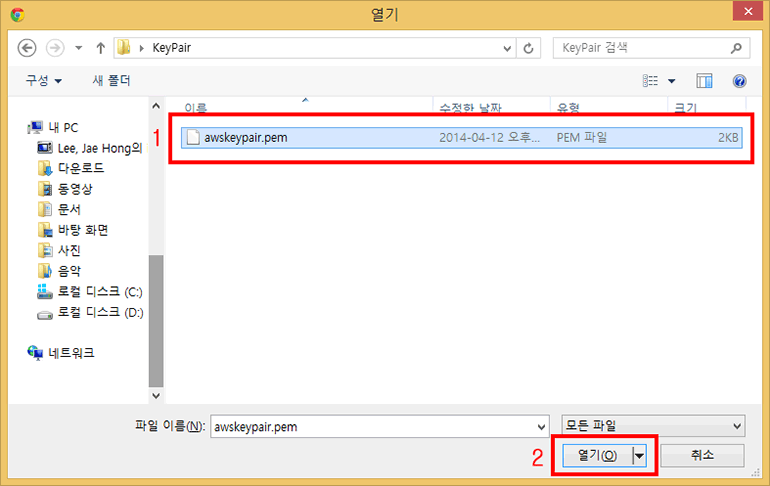 키 쌍을 생성할 때 다운로드한 pem 파일을 선택합니다. 키 쌍 다운로드는 '4.3 EC2 인스턴스 생성하기', '7.1 키 쌍 생성하기'를 참조하기 바랍니다.