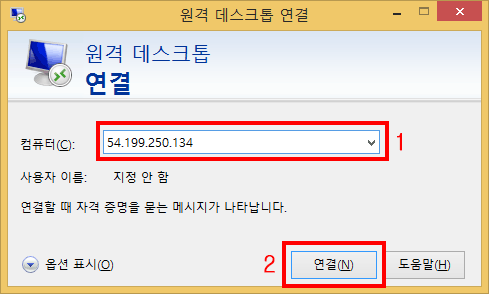 Windows에서 원격 데스크톱 연결(시작 → 실행 → mstsc)을 실행합니다. 그리고 IP 주소를 입력한 뒤 연결(N) 버튼을 클릭합니다.
