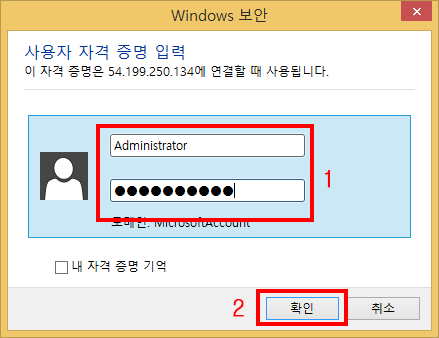 사용자 자격 증명 입력에 Administrator와 방금 복호화한 비밀번호를 입력하고 확인 버튼을 클릭합니다.