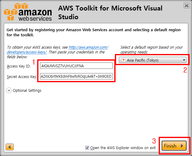 액세스 키와 시크릿 키를 입력하고, 리전을 선택한 뒤 Finish 버튼을 클릭합니다. 액세스 키와 시크릿 키를 생성하는 방법은 '9장 API와 툴 사용을 위한 액세스 키 생성하기'를 참조하기 바랍니다.