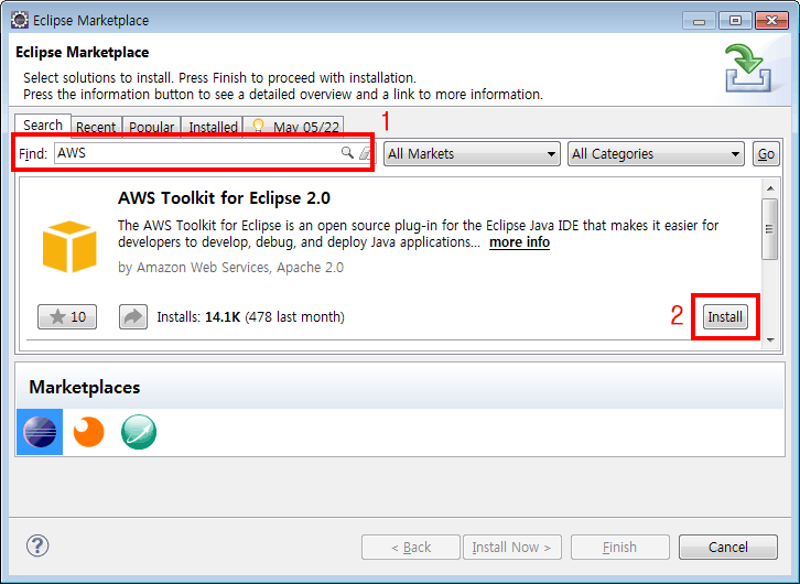 Eclipse Marketplace에서 Find에 AWS를 입력하여 플러그인을 검색합니다. AWS Toolkit for Eclipse 2.0이 검색되면 Install 버튼을 클릭합니다.