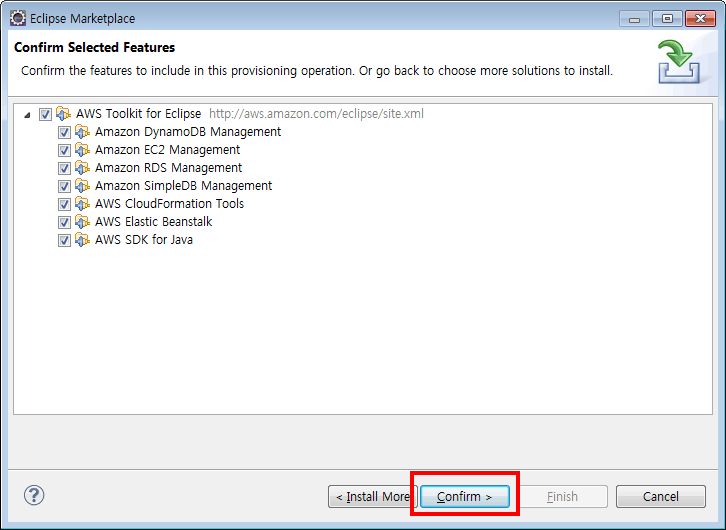 설치할 AWS Toolkit for Eclipse이 표시됩니다. Confirm 버튼을 클릭합니다.