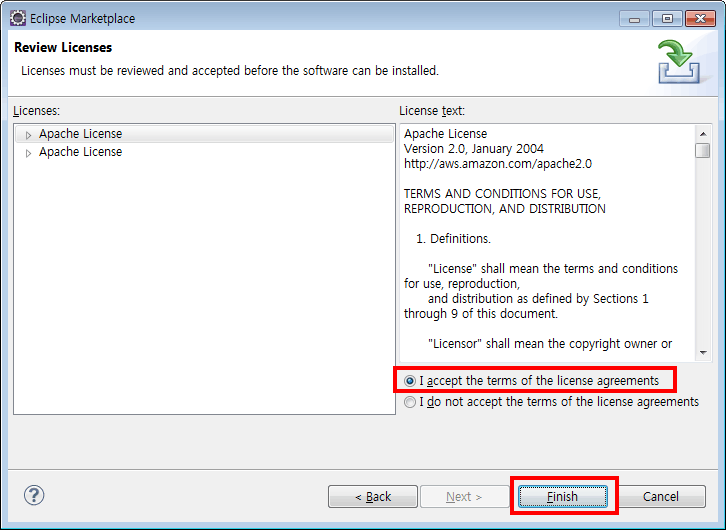 라이선스 동의 화면이 표시됩니다. I accept the terms of the license agreements를 선택하고 Finish 버튼을 클릭합니다.