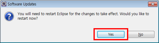 AWS Toolkit for Eclipse 설치가 완료되면 Eclipse를 재시작하라는 경고 창이 표시됩니다. Yes 버튼을 클릭합니다.