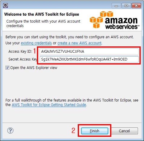 Eclipse가 재시작되면 액세스 키와 시크릿 키를 설정하는 화면이 표시됩니다. 액세스 키와 시크릿 키를 입력하고 Finish 버튼을 클릭합니다. 액세스 키와 시크릿 키를 생성하는 방법은 '9장 API와 툴 사용을 위한 액세스 키 생성하기'를 참조하기 바랍니다.