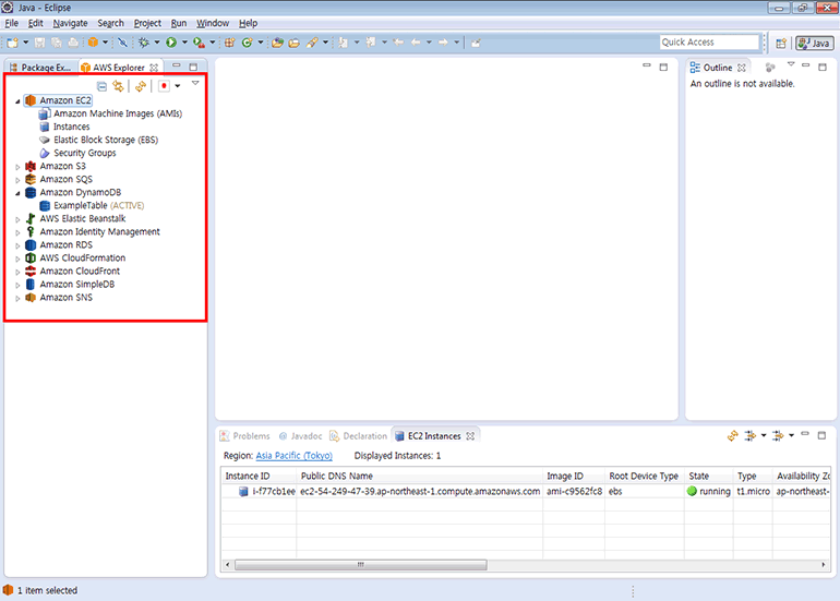 Eclipse에 AWS Explorer가 표시됩니다. 여기서 AWS 리소스를 제어할 수 있습니다.