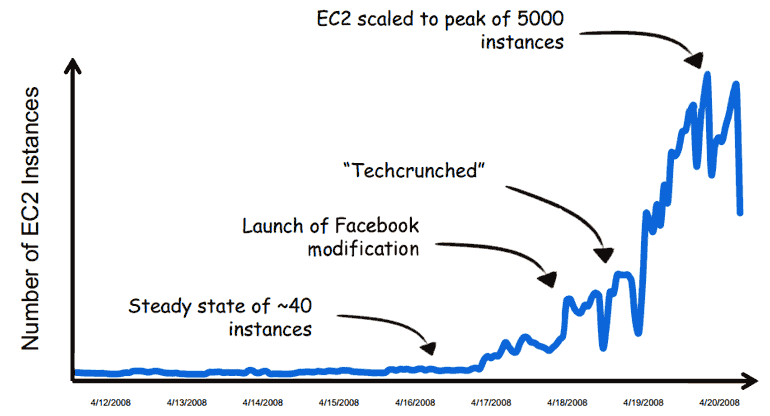 애니모토animoto.com는 사진을 동영상으로 만들어주는 서비스입니다. 평상시에는 EC2 인스턴스를 40개 정도로 운영했었는데, 이후 페이스북 연동 기능을 추가하고 테크크런치Techcrunch에 소개되면서 사용자가 급격히 늘어났습니다. 3일 만에 EC2 인스턴스가 40개에서 5,000개로 늘어난 것입니다.