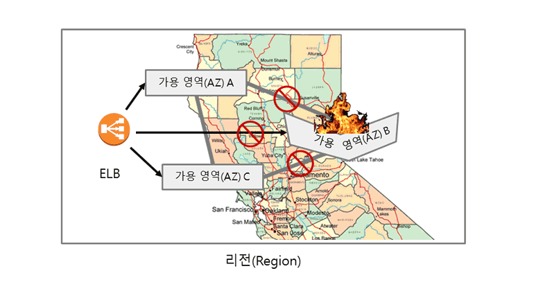 실제로 AWS에서는 EC2 가상 서버를 한 리전 안에서도 여러 가용 영역에 만들어서 사용할 것을 권장하고 있습니다. 로드 밸런서인 ELBElastic Load Balancing는 같은 리전 안에 여러 가용 영역에 걸쳐 있는 EC2에 트래픽을 분배해줄 수 있습니다. 이렇게 하면 가용 영역 하나가 작동불능이 되더라도 무중단 서비스를 제공할 수 있습니다.